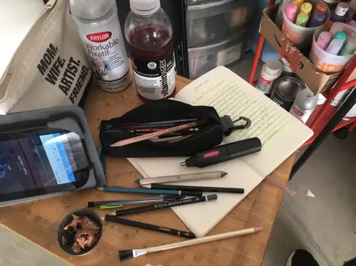 It's here, in my garage studio, I learn the most; finding balance and mental clarity through an ever-growing process. When a series starts, days are spent making use of daylight to cut and sand, building cradle frames for larger panel pieces, and drawing into the wee hours of the morning. Sometimes I'm mixing paint, packing and preparing for a custom mural. My headphones and music are always a part of it all. Mostly its where I get to experiment and play, dance and work, read and be silent. It is my happy place, where I'm free to bare it all, create to the music that moves me, utilizing the tools and education my artist father showed me as a child, inhaling the sweet smell of fresh-cut wood, feeling like I'm exactly where I need/want to be.